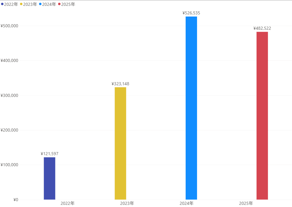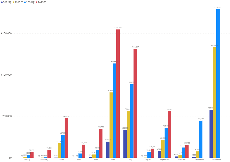 青が2022年の月別で、黄色が2023年の月別推移、水色が2024年、赤色が2025年の月別推移になっています。