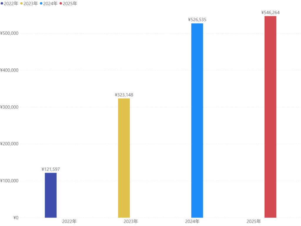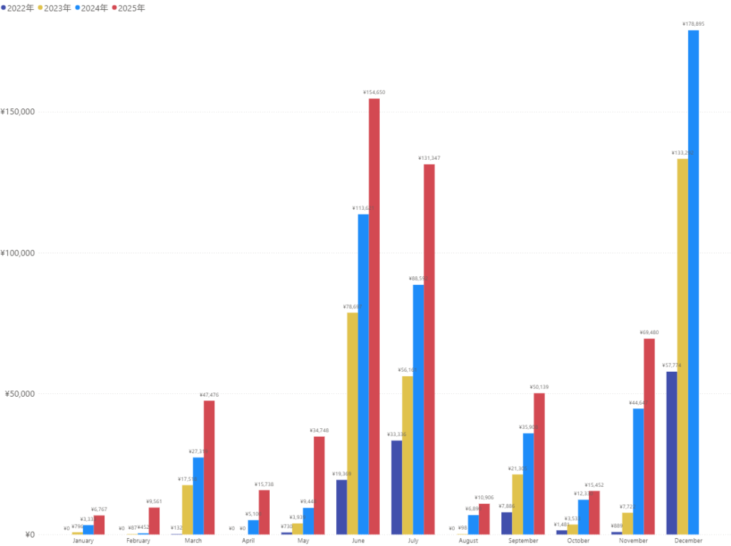 青が2022年の月別で、黄色が2023年の月別推移、水色が2024年、赤色が2025年の月別推移になっています。