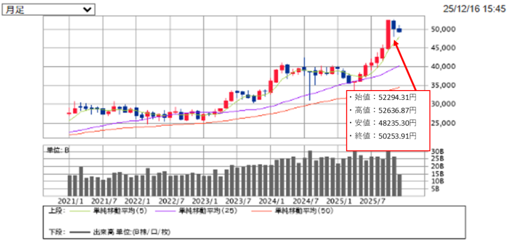 10月は大幅な上昇でしたが、11月は調整相場となりましたが、まだ5万円台をキープしています。