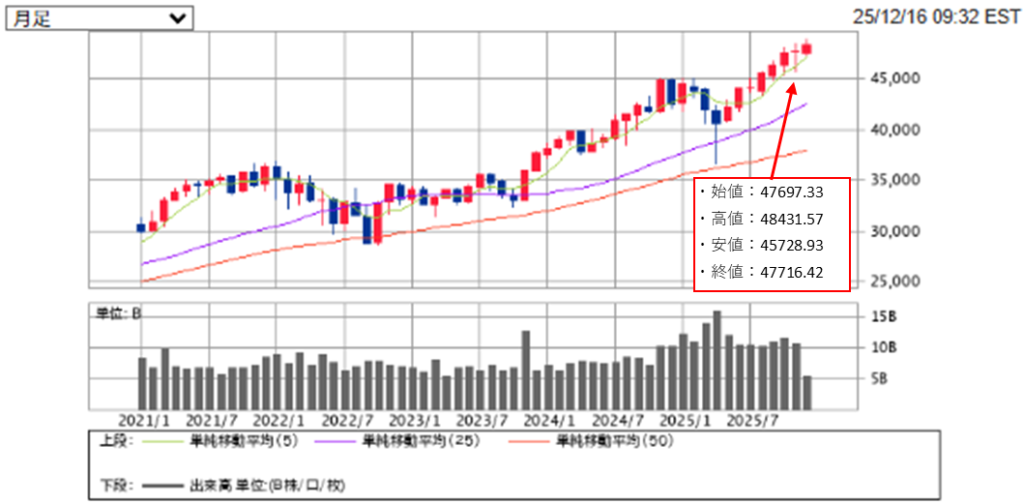 NYダウ平均について、2025年11月は始値から終値で約19ドル(0.04%)の上昇となりました。