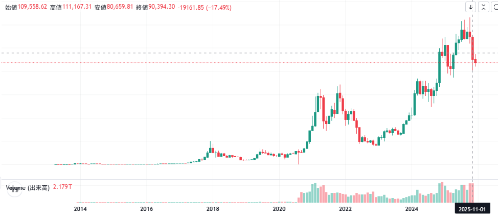 仮想通貨について、11月のビットコインは前月比約-19,164ドル(約-17.5%)と大幅な下落相場となりました。