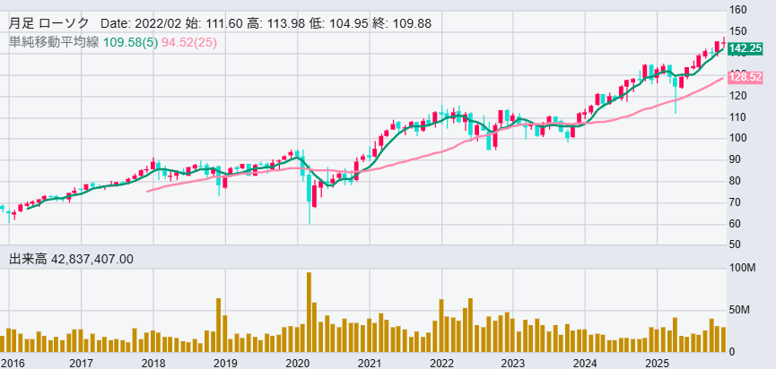 また、ここ10年間の株価推移は以下の通りになっています。(グラフは月足)