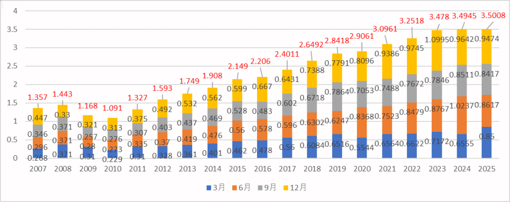 2025年は3月は大幅増配、6月、9月、12月は減配、年間トータルでは僅かな増配です。